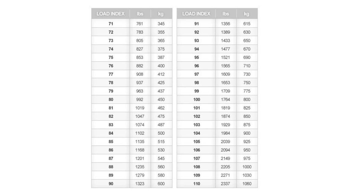 Typically, the load indexes of the tires used on passenger cars and light trucks range from 70 to 110.